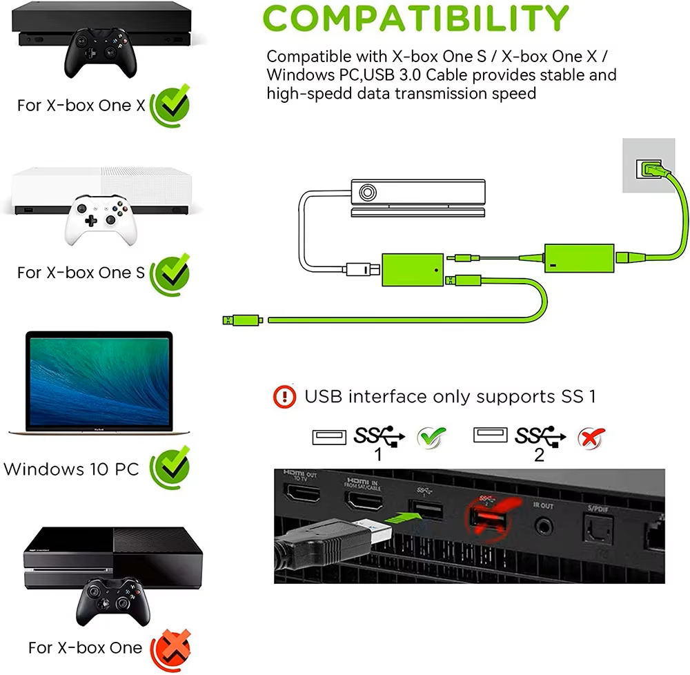 Pozor, adaptér nefunguje s nejnovější generací Xbox Series S ani Xbox Series X – tyto konzole Kinect nepodporují vůbec. Zároveň je třeba mít na paměti, že hry určené pro Xbox 360 s podporou Kinect nebudou fungovat na Xbox One, a to ani s tímto adaptérem – jedná se o zcela nekompatibilní generace her a hardwaru. Adaptér je určen výhradně pro Xbox One rodinu (S, X) a PC.