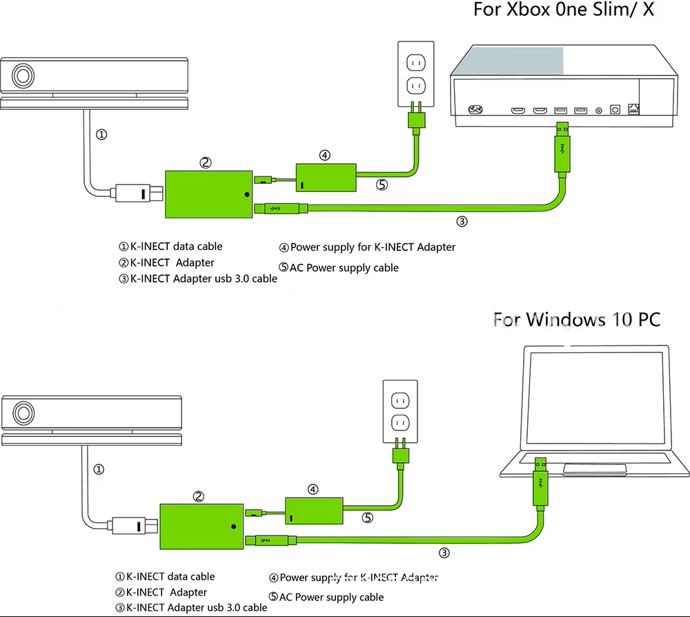 Adaptér převádí signál ze senzoru Kinect do USB 3.0 portu konzole Xbox One S nebo X, současně zajišťuje napájení a komunikaci s Kinectem. Instalace je plug-and-play – konzole adaptér automaticky rozpozná, takže po zapojení stačí spustit hru a Kinect funguje bez dalšího nastavování. Na Windows PC je postup analogický – po zasunutí adaptéru do USB portu a instalaci Kinect SDK bude senzor detekován a připraven k použití.