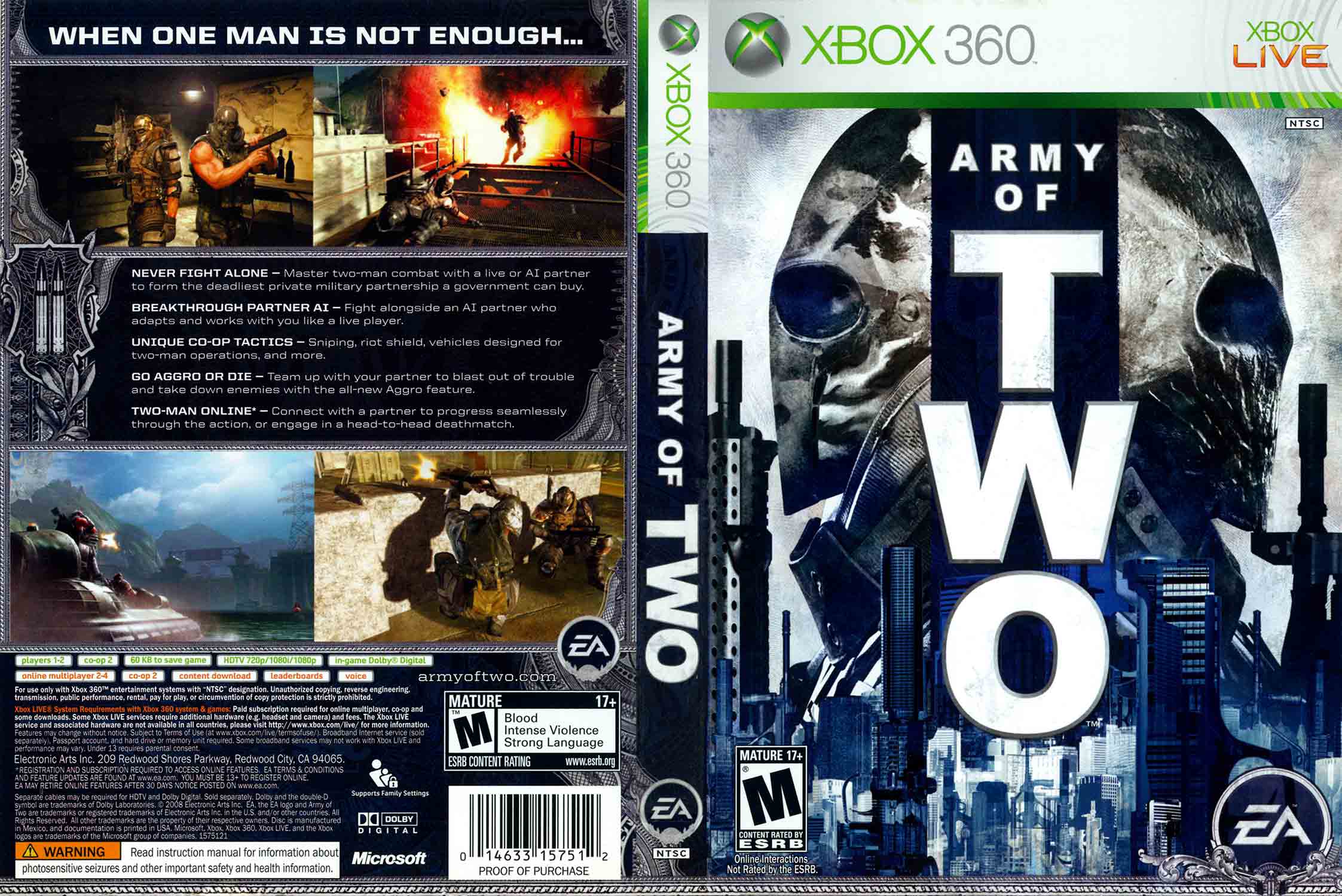 Army of Two pro XBOX 360 byla od základu navržena pro hraní ve dvou. Systém aggro představuje nejoriginálnější mechaniku hry. Jeden hráč na sebe strhne pozornost nepřátel intenzivní střelbou, zatímco druhý se nenápadně přesune na výhodnější pozici a zasáhne zezadu.