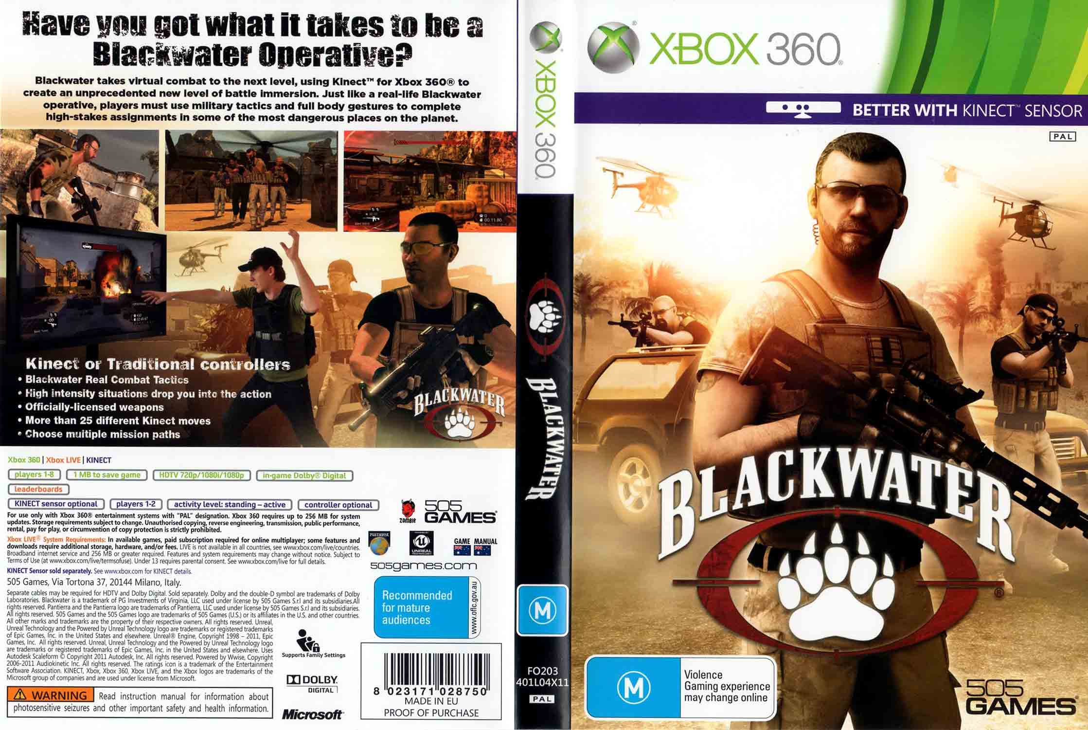 Blackwater pro XBOX 360 je akční střílečka, ve které se celé vaše tělo stává ovladačem. Jako operativec elitní soukromé vojenské jednotky se vydáváte do severoafrického konfliktu, kde střílíte, mířite a uhýbáte střelám vlastními pohyby. Dynamické přestřelky v pouštních městech a průmyslových zónách vás vtáhnou do akce od první minuty.