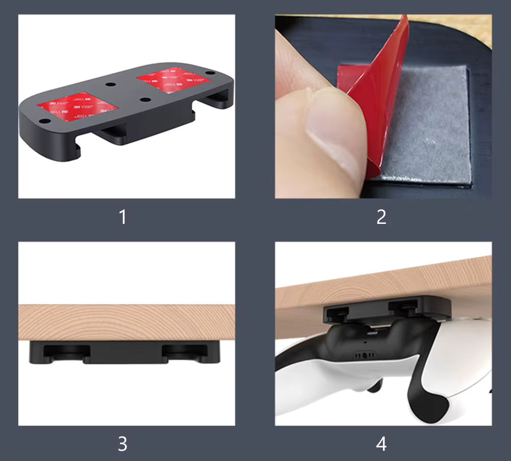 Držák na ovladač Playstation pod stůl můžete namontovat dvěma způsoby podle toho, co vám víc vyhovuje. Pro rychlou instalaci bez vrtání použijete silné samolepicí pásky, které spolehlivě drží na hladkém povrchu stolu či police. Pokud dáváte přednost maximálně pevnému uchycení, sáhnete po přiloženém šroubu – ideální volba pro těžší desky nebo dlouhodobé použití na jednom místě.