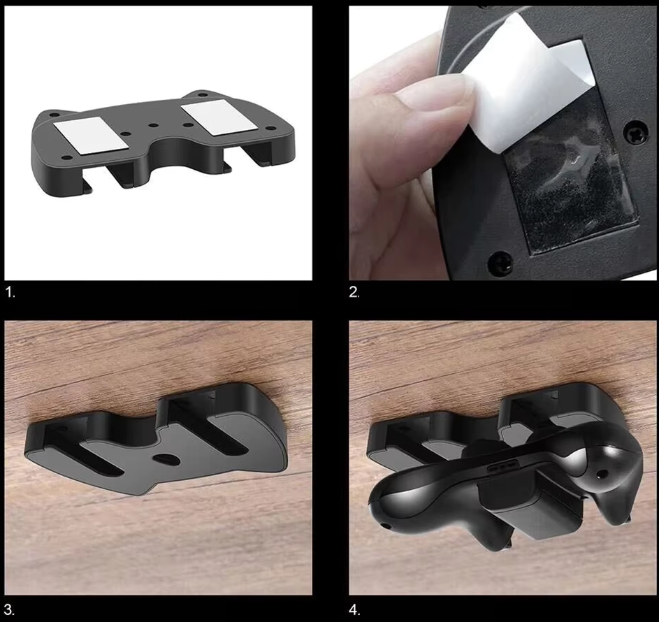 Tento držák je navržen s důrazem na univerzální kompatibilitu a snadnou instalaci. Díky promyšlenému designu poskytuje bezpečné uložení pro váš gamepad, když zrovna nehrajete. Držák lze snadno připevnit pod desku stolu nebo polici pomocí přiložených kvalitních samolepek nebo šroubu, který je součástí balení.