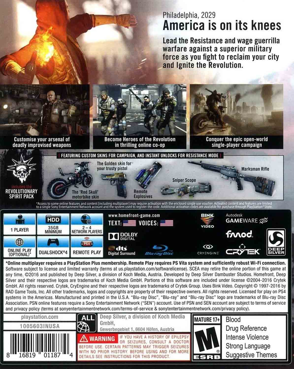 Homefront: The Revolution okázale pokračuje v zápletce z prvního dílu. V roce 2025 zaútočila Severní Korea na katastrofami oslabené Spojené státy a protože měla k dispozici výraznou technologickou podporu (předtím pohltila jižní část Korejského poloostrova i Japonsko) USA poměrně rychlou válku prohrály. Hra nás uvede do děje asi čtyři roky poté, kdy Korejská lidová armáda svírá civilní obyvatelstvo ocelovou pěstí brutálního režimu. Náš hrdina se jmenuje Ethan Brady a není to bývalý voják, policista nebo příslušník speciálních sil. Je to úplně normální chlápek, který se ve Filadelfii rozhodl postavit utiskovatelům na odpor a začít tak guerillovou válku!
