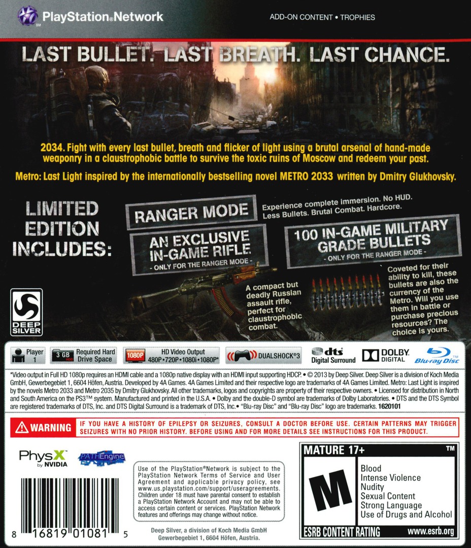 Metro: Last Light pro PS3 vás zavede do ponuré, radioaktivní metropolitní sítě po jaderné apokalypse. Tento first-person shooter s důrazem na atmosféru a příběh vás postaví do role Artyoma, který bojuje nejen s mutovanými bestiemi, ale i s lidskými frakcemi soupeřícími o přežití.