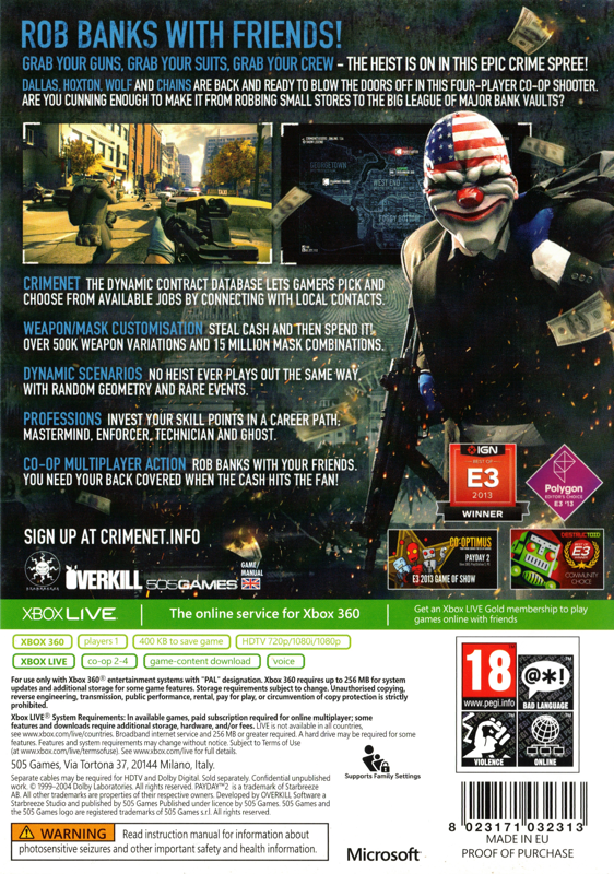 Sestavte tým, naplánujte přepadení a proveďte ho k dokonalosti — Payday 2 pro XBOX 360 je kooperativní střílečka z pohledu první osoby, která přináší filmové loupežné akce přímo do vašeho obýváku. Společně se třemi spoluhráči se vydáte na desítky riskantních misí napříč americkým podsvětím.