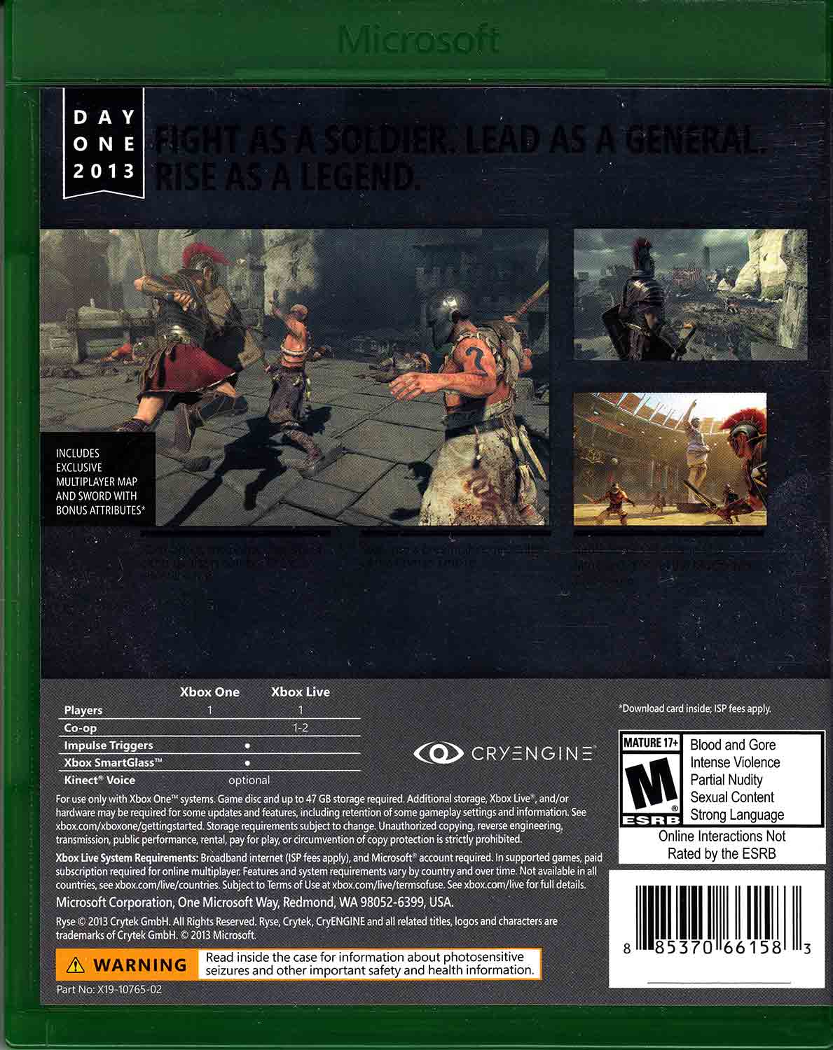 ** Hra „Ryse: Son of Rome” přináší niterní surový realistický zážitek z impozantních bitev, okořeněných dechberoucí vizuální stránkou, která ustanoví standard pro akční hry další generace. Prožijte nemilosrdnou historii starověkého Říma a zapojte se do nemilosrdných potyček proti barbarské hordě. Využijte meč i štít jako zbraně k útoku, blokujte a provádějte protiútoky a kruté popravy.