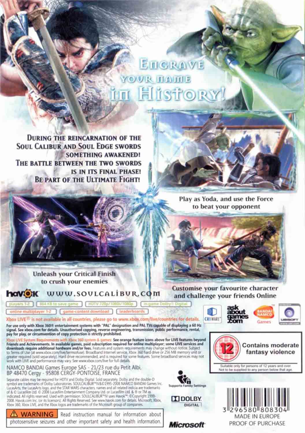 Vstupte do arény legendárního soubojového turnaje — Soul Calibur IV pro XBOX 360 je čtvrtý díl kultovní bojové série, která proslula dynamickými souboji se zbraněmi. Studio Bandai Namco přináší propracovaný bojový systém, úchvatnou grafiku a překvapivé hostující postavy ze světa Star Wars.