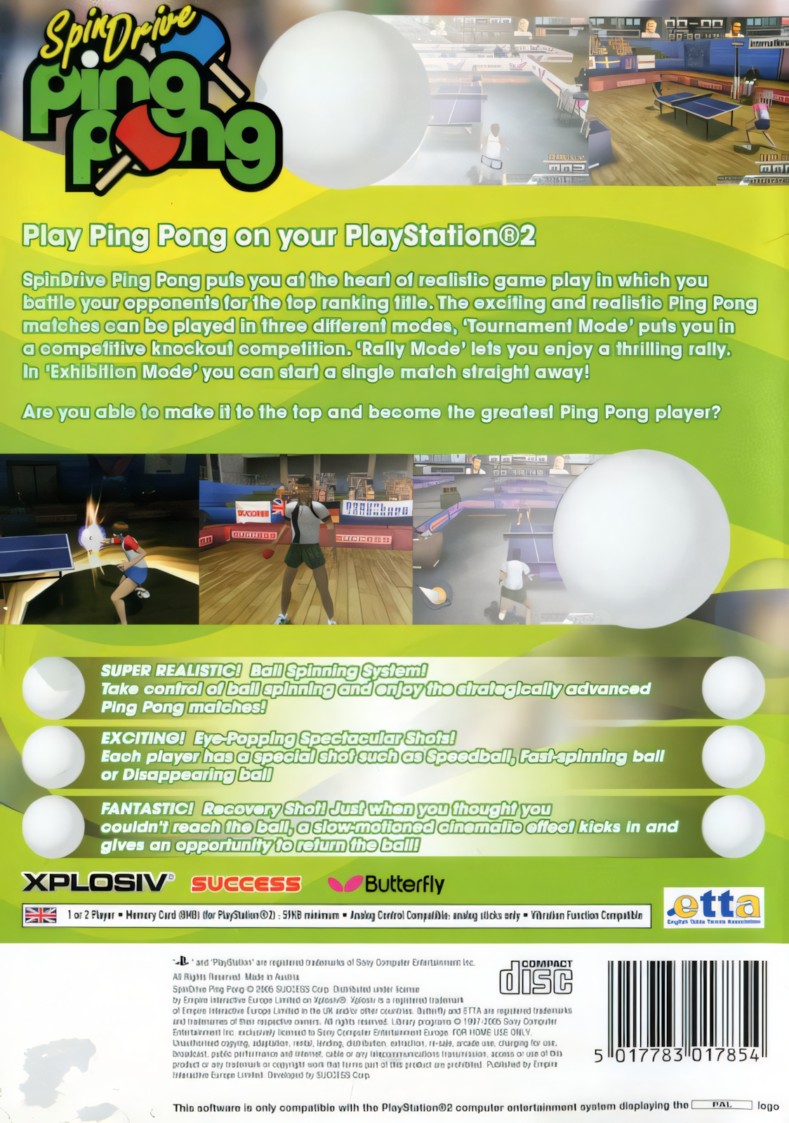 Stolní tenis v té nejrychlejší a nejzábavnější podobě přichází na vaši konzoli. Spin Drive Ping Pong pro PS2 je sportovní hra, která vás vtáhne do svižných a realistických pingpongových zápasů plných techniky, rychlosti a napínavých výměn. Pokud hledáte parádní sportovní titul pro PlayStation 2, tato hra vás rozhodně nezklame.