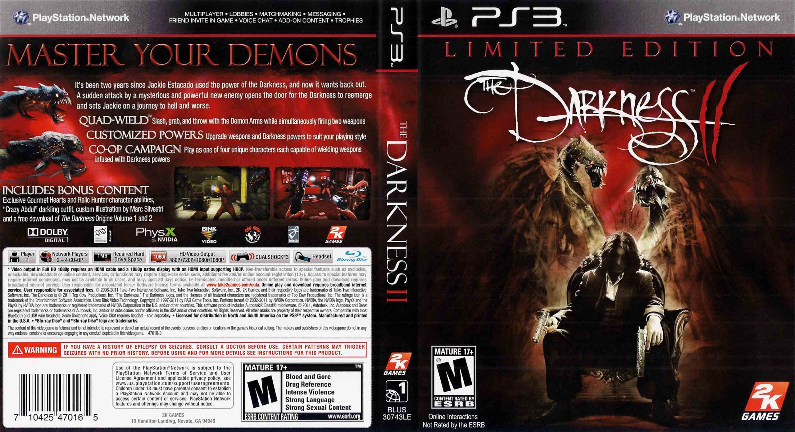 Jackie Estacado se vrací v pokračování jednoho z nejoriginálnějších akčních titulů. The Darkness II pro PS3 vás vtáhne do příběhu mafiánského bosse, který se snaží udržet pod kontrolou prastarou démonickou sílu sídlící v jeho těle. Dva roky po událostech prvního dílu Jackie vede klidný život v čele rodiny Franchetti — dokud ho brutální atentát nedonutí Temnotu znovu uvolnit.