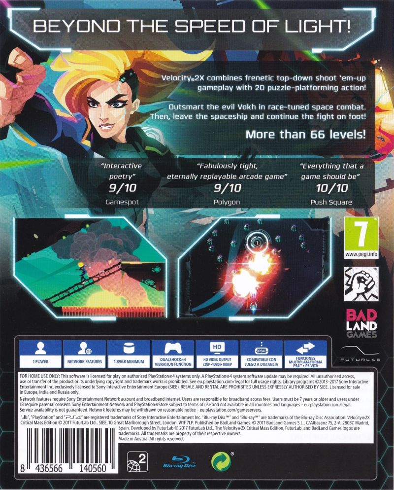 Staňte se certifikovaným výtržníkem. Lai Kai Tana, unesená rasou nepřátelských mimozemšťanů, musí použít své rychlé reflexy a teleportující sílu Quarp Jet, aby osvobodila své spoluvězně a našla cestu domů. Velocity 2X přechází sem a tam mezi vertikálním snímáním shora dolů a postranním rolováním akční plošinovky a spojuje dva jedinečné styly rychlého a frenetického hraní do jednoho neuvěřitelného zážitku.